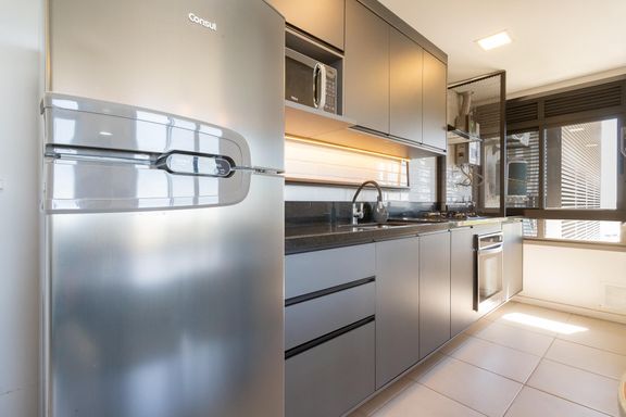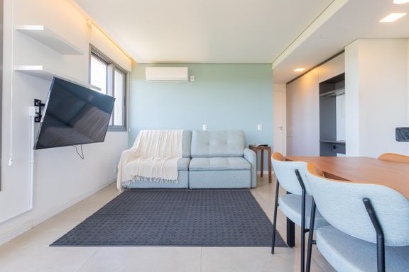 Ambiente amplo com 54,64 m², mobiliado, com 1 dormitório, sala de estar e jantar, cozinha com churrasqueira para aproveitar momentos em família e amigos, lavanderia e banheiro social. Possui vaga de garagem coberta, garantindo conforto e organização.