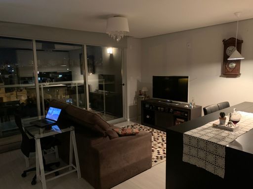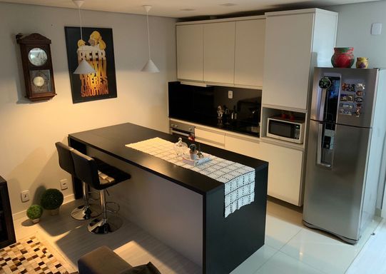 Ambiente integrado com sala de estar e cozinha, sacada, banheiro social e uma vaga de garagem coberta. Possui móveis planejados na cozinha incluindo forno, fogão e água quente, oferecendo conforto, funcionalidade e praticidade.