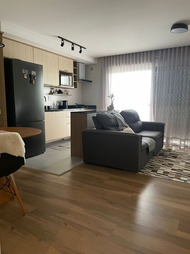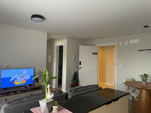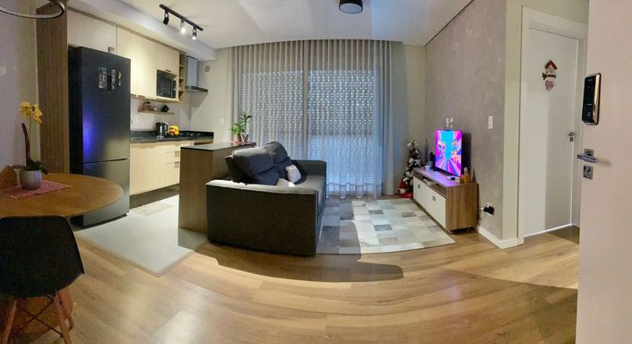 A planta conta com dois dormitórios sendo um suíte, sala de estar e jantar integradas à cozinha americana, sacada com churrasqueira para compartilhar momentos em família e amigos e área de serviço. Ambientes climatizados, móveis planejados e detalhes como gesso rebaixado e fechadura digital elevam o padrão de bem-estar.