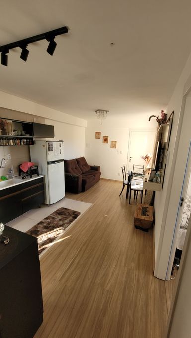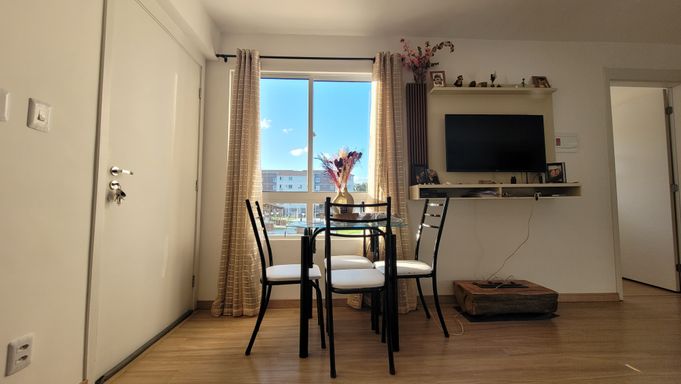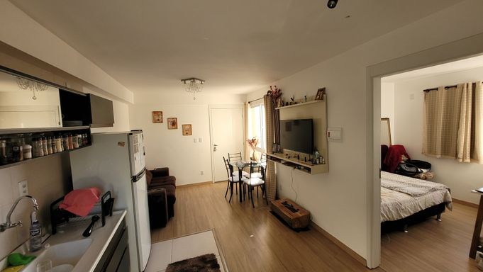 O imóvel semi mobiliado conta com 2 quartos, sala de estar e cozinha integradas, área de serviço e banheiro social. A cozinha permanece mobiliada, com possibilidade de manter outros móveis, garantindo mais praticidade no dia a dia.