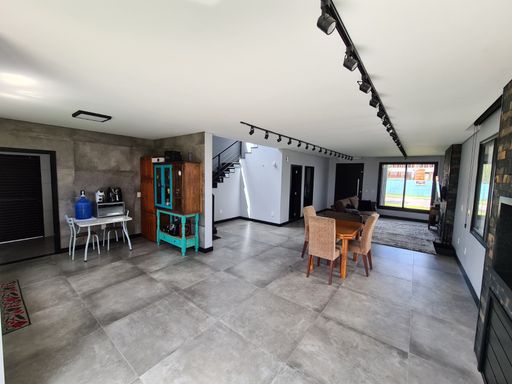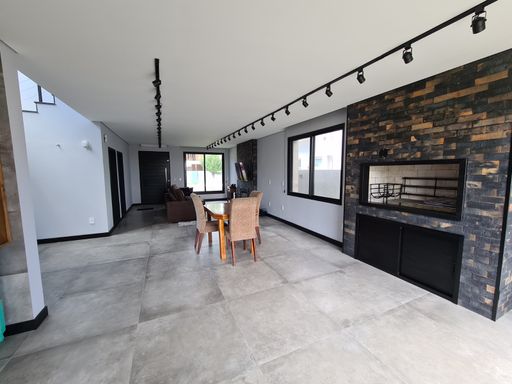 No pavimento superior, são três dormitórios com amplas sacadas, sendo uma suíte com closet e mais um banheiro compartilhado. No térreo, a casa conta com ambientes integrados de estar com lareira, jantar, cozinha com parrilla, além de escritório (ou dormitório), banheiro e lavanderia. A área externa oferece depósito e garagem coberta para dois carros.